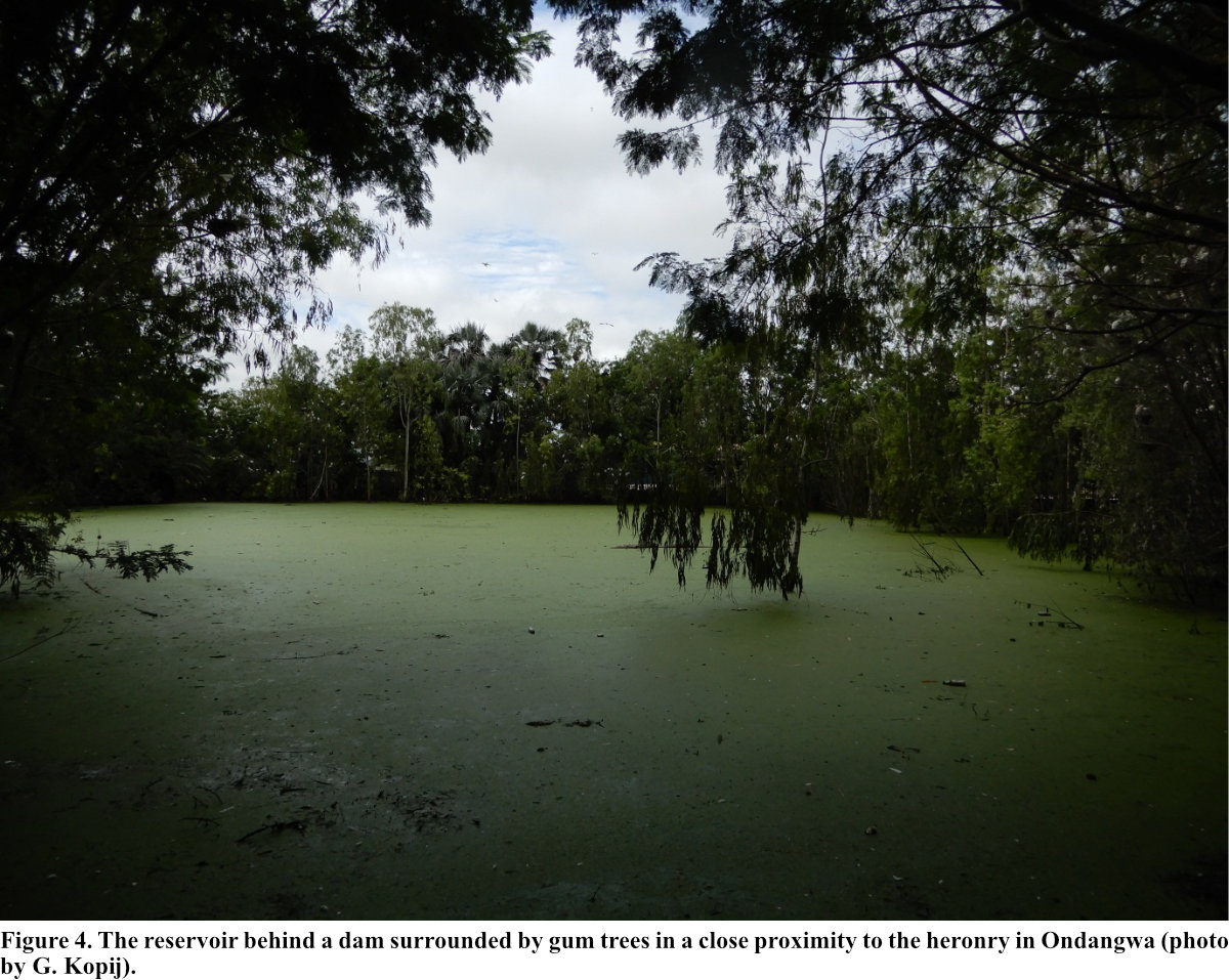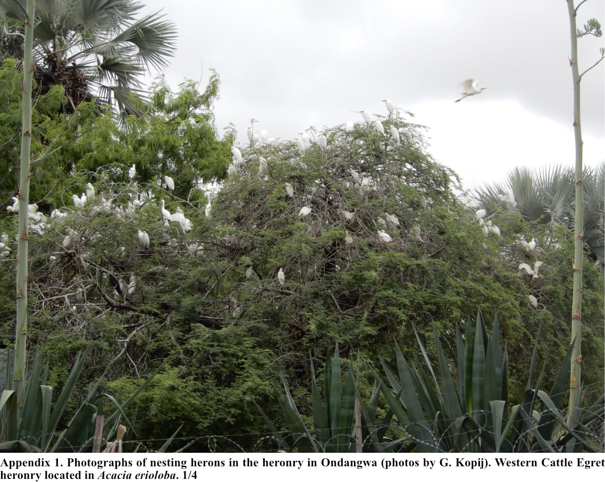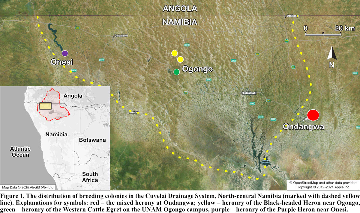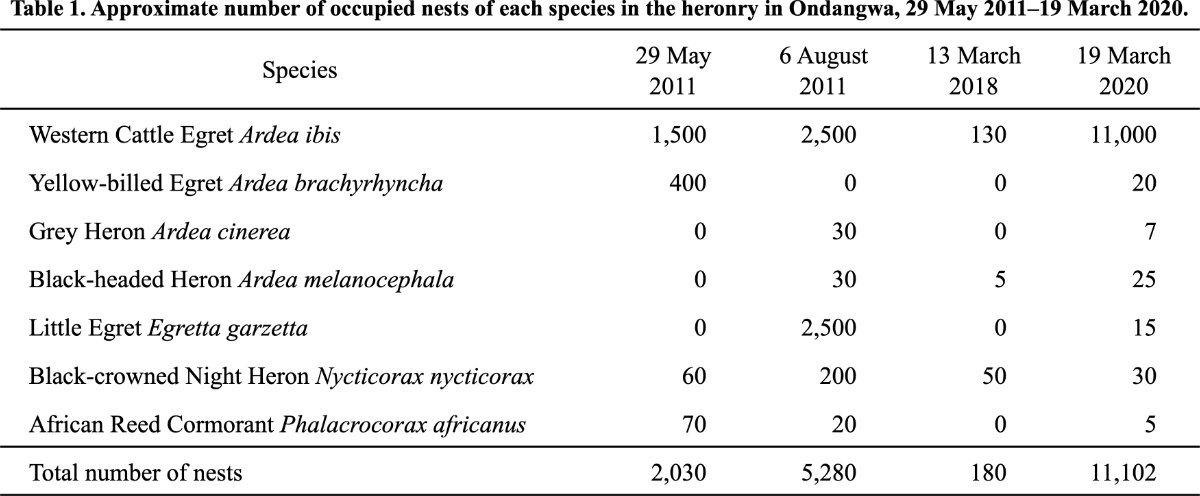 The heronry in Ondangwa is the only long-lasting heronry which was found in the whole survey of the Cuvelai Drainage System (c. 40,000 km2) during 2011-2020. In addition to this, two small ephemeral (disappeared after 1-2 years) heronries (2-4 nests) of the Black-headed Heron were found near Ogongo, Omusati Region, and a small colony of 2-3 pairs of Purple Heron (Ardea purpurea) were discovered at the Olushandja dam, 3.5 km NE of Onesi in 2019-2020 (Fig. 1). In 2018, Western Cattle Egrets established an ephemeral colony comprising c. 1,000 nests around a dam of the NamWaters on the UNAM Ogongo campus. Nests were located in two trees. The heronry was, however, totally demolished by the NamWater (information from NamWater authorities), when most birds were already incubating their eggs.